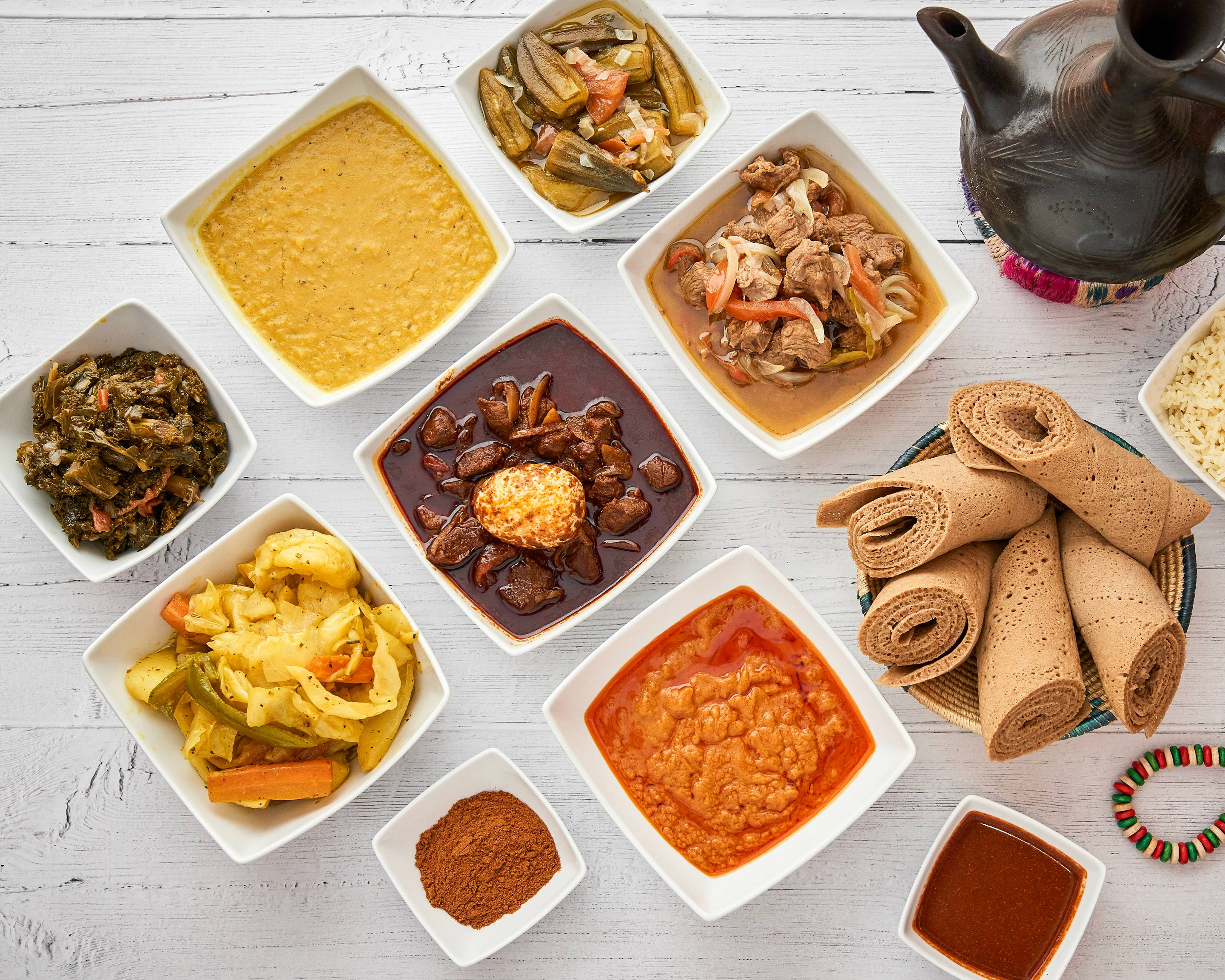 Ethiopian food is like the Ethiopians themselves: spicy, subtle, and piquant and most of all, unforgettable. It is a cuisine that developed completely without sugar, and that traditionally put salt in its coffee. The variety is astonishing.